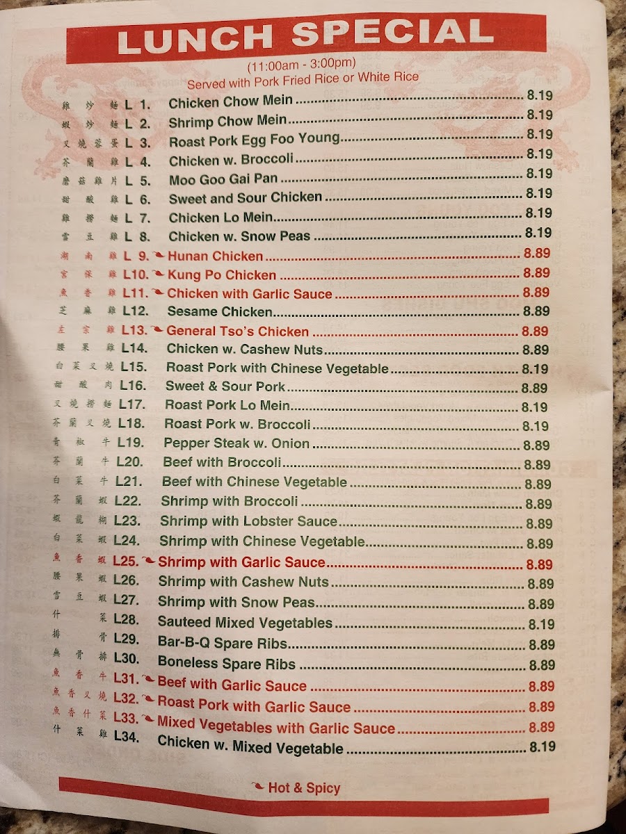 Typical dishes like Chicken Chow Mein, Moo Goo Gai Pan, or General Tso's Chicken provide hearty, balanced options that pair well with the restaurant’s welcoming, unpretentious atmosphere. The menu strikes a comfortable balance between lighter vegetable and pork options, rich savory specialties, and the occasional dish with a bit of a spicy kick for those looking for a little extra flavor.